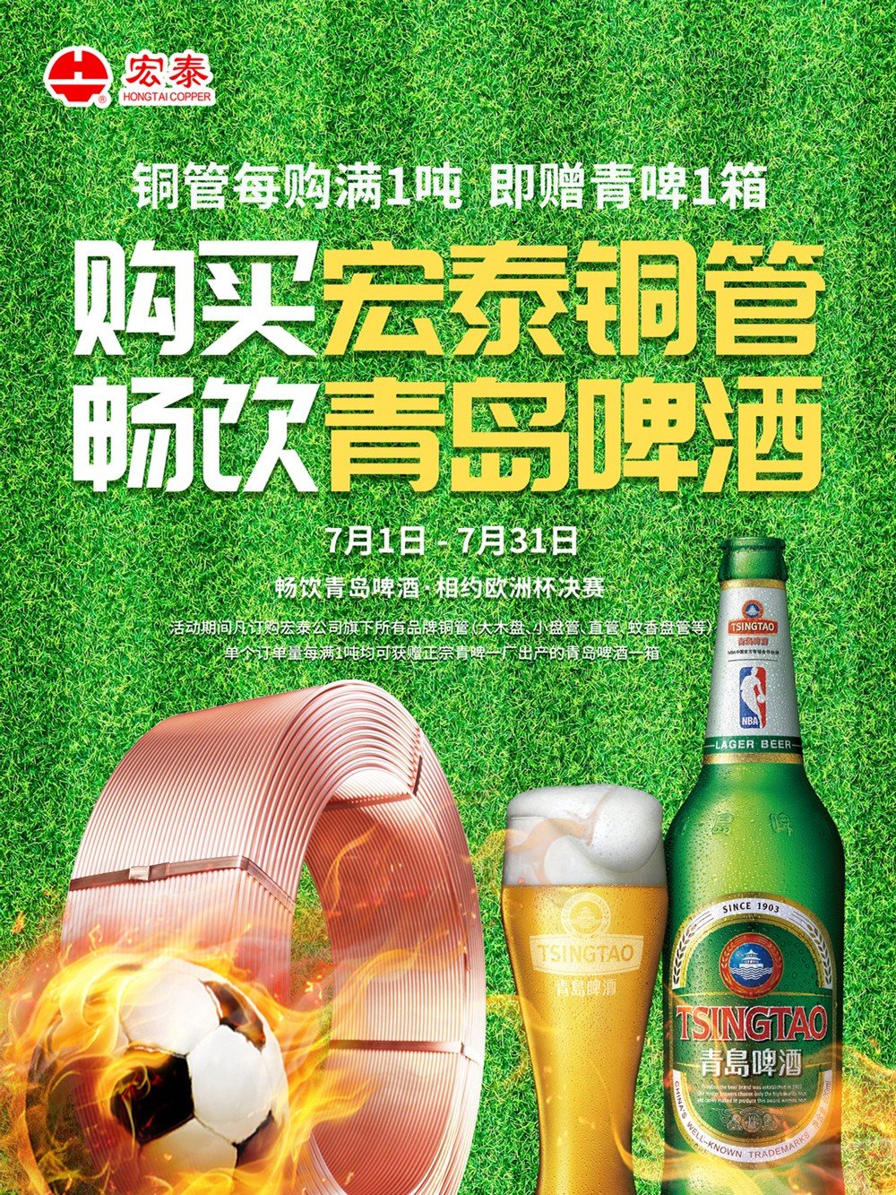 7月1日至7月31日期間,凡訂購(gòu)宏泰公司旗下所有品牌銅管(大木盤、小盤管、直管、蚊香盤管等)的客戶,單個(gè)訂單量每滿1噸,即可獲贈(zèng)青啤一廠生產(chǎn)的青島啤酒一箱!
