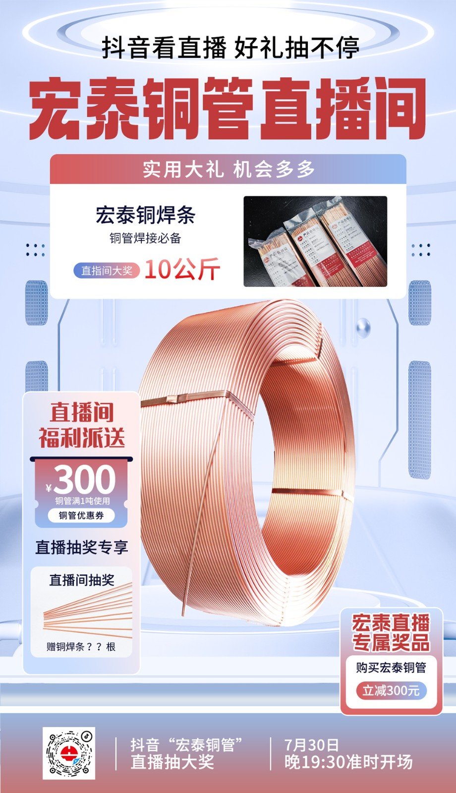 每周五晚19:30,宏泰銅管準時開啟直播,全程不定時抽獎,我們為大家準備了豐富的獎品,還有驚喜大獎——10公斤銅焊條和300元銅管優惠券等好禮等您來拿!呼朋喚友一起來,中獎幾率翻倍哦!掃描上圖二維碼預約~我們直播見!