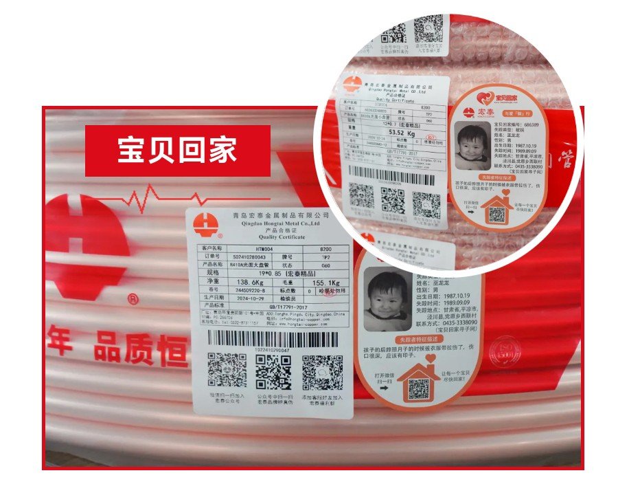 宏泰在銅管產(chǎn)品包裝上添加“寶貝回家”公益廣告,上面有兒童信息、官網(wǎng)二維碼和簡短宣傳語,讓產(chǎn)品成為流動的宣傳媒介。