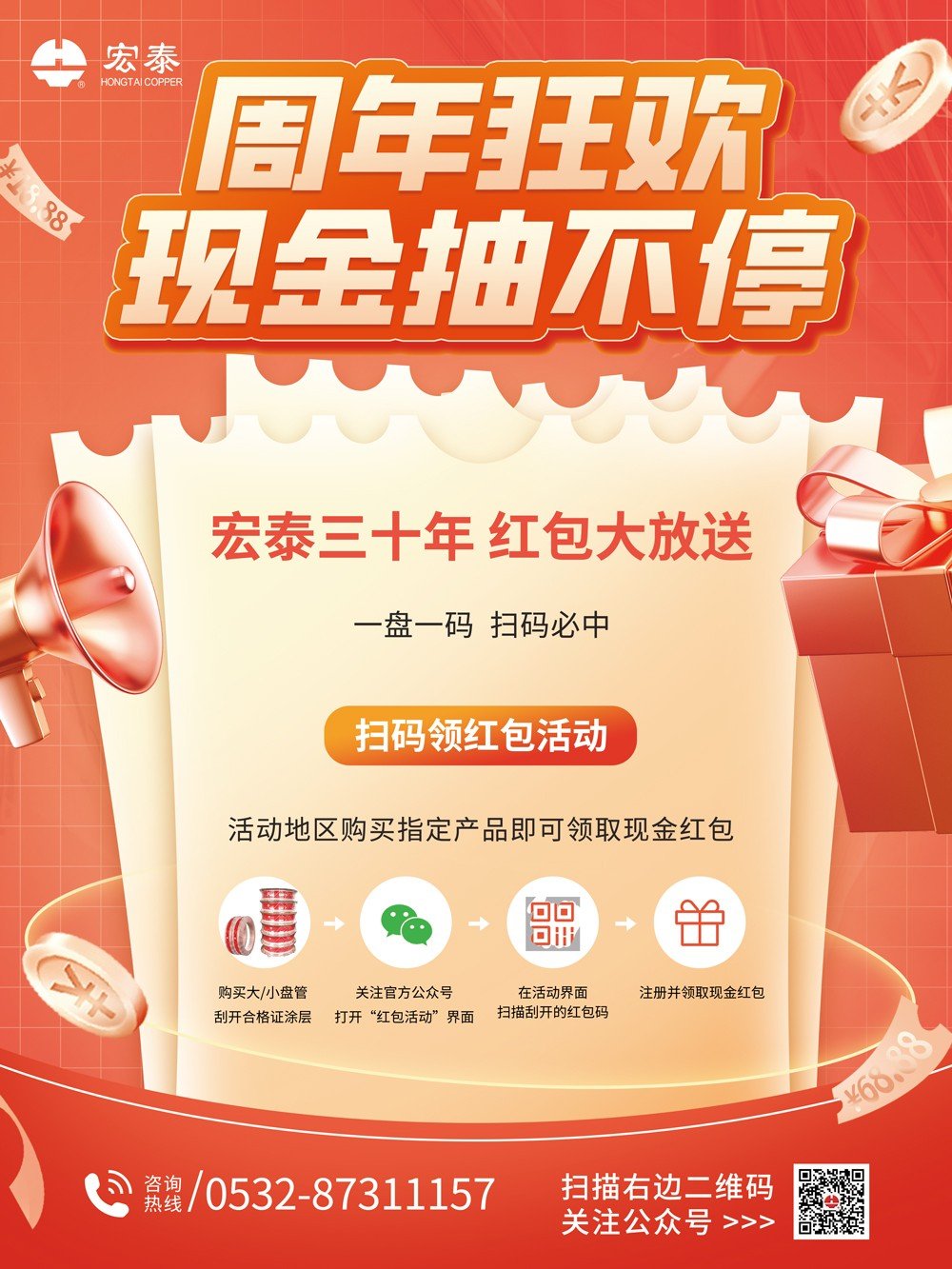 2023年,宏泰30歲。在這具有重大意義的時(shí)刻,公司經(jīng)過前期的技術(shù)研發(fā),決定在宏泰30年來臨之際,推出感恩客戶的又一具體活動(dòng)——掃碼領(lǐng)紅包。凡是宏泰銅管的終端用戶,購買宏泰銅管后,通過手機(jī)掃碼,均可領(lǐng)取金額不等的紅包。公司通過這一活動(dòng),力促進(jìn)一步粘合與客戶緊密度,真正做到回饋終端客戶。通過掃碼領(lǐng)紅包活動(dòng),讓客戶真切感受到公司在回饋客戶方面的熱情。為了真正做到回饋終端客戶,參與該活動(dòng)的,僅限宏泰銅管的終端客戶,經(jīng)銷商不參與該活動(dòng)。讓利終端客戶(非中間商),這在宏泰歷史上是首次,是一次全新的嘗試,公司后期會(huì)推出更多的感恩客戶的具體活動(dòng),敬請期待。